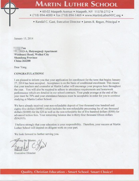 潘同學,威海環(huán)翠國際中學初四學生,在青島某機構培訓英語后申請美國中學失敗,后經昌華留學歐美負責老師的申請辦理順利拿到美國馬丁路德高中的OFFER,將于二月初赴美國。
